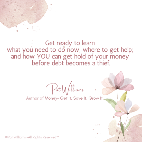Patricia Lane Williams, CPA has worked with thousands of men and women sounding the warnings. She is the author of the Amazon bestseller, Money: Get It. Save It. Grow It … Before Debt Steals It. It’s her first book in the Four Corners Prosperity series. Her website is www.PatWilliamsAuthor.com.