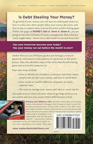 Patricia Lane Williams, CPA has worked with thousands of men and women sounding the warnings. She is the author of the Amazon bestseller, Money: Get It. Save It. Grow It … Before Debt Steals It.