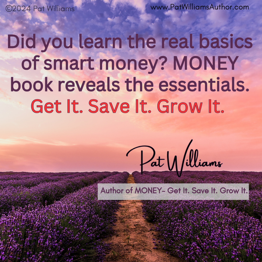 Patricia Lane Williams, is a retired CPA has worked with thousands of men and women sounding the warnings. She is the author of the Amazon bestseller, Money: Get It. Save It. Grow It … Before Debt Steals It. It’s her first book in the Four Corners Prosperity series. Her website is www.PatWilliamsAuthor.com.